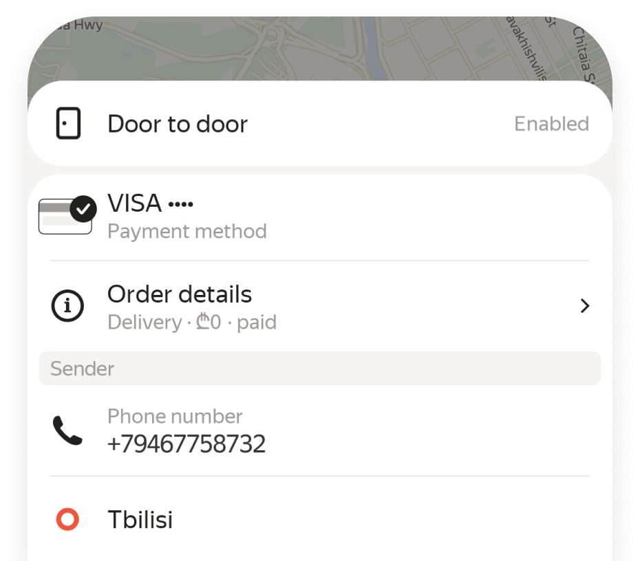To order your first delivery, go to the Yandex Go app, select Delivery, enter the recipient's address and select the service class, and specify all the details.